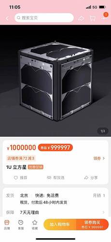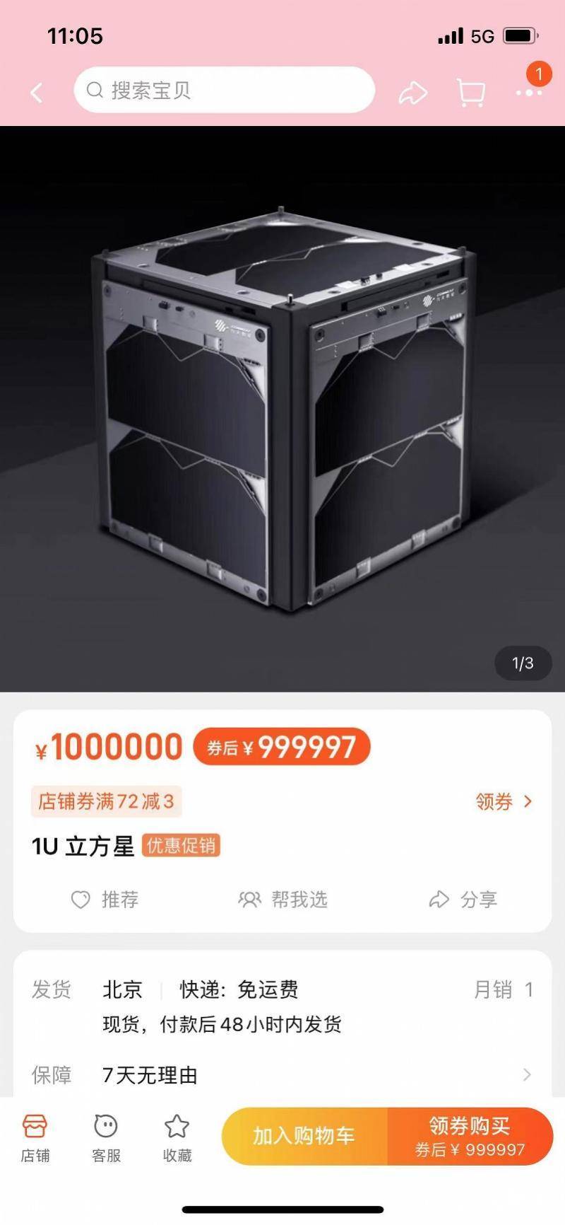 此次在罗永浩直播间出售的卫星,1U立方星,体积为10cm×10cm×10cm。原本的购买费用加上发生费用为200万元,在直播间直降100万,售价100万元。