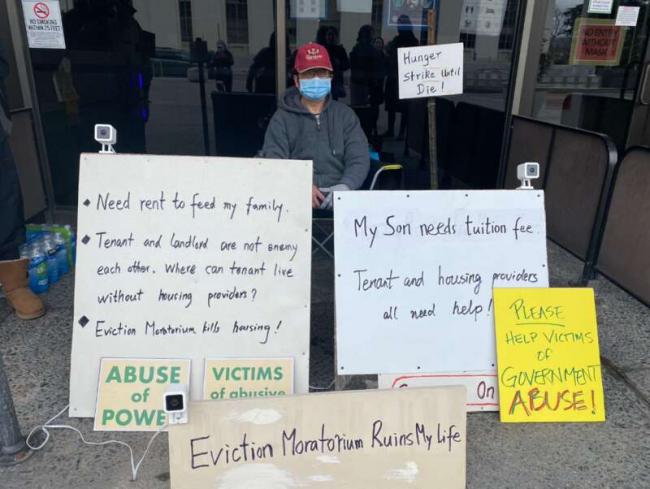 在疫情前,吴先生就上诉,但由于阿拉米达县的暂停驱逐令(eviction moratorium)的保护,法院至少18次推迟开庭。他难以维持生计,处于破产边缘。忍无可忍之下,26日起在阿县办公楼外绝食抗议,“至死方休”,希望废除暂停驱逐令这一“恶法”。