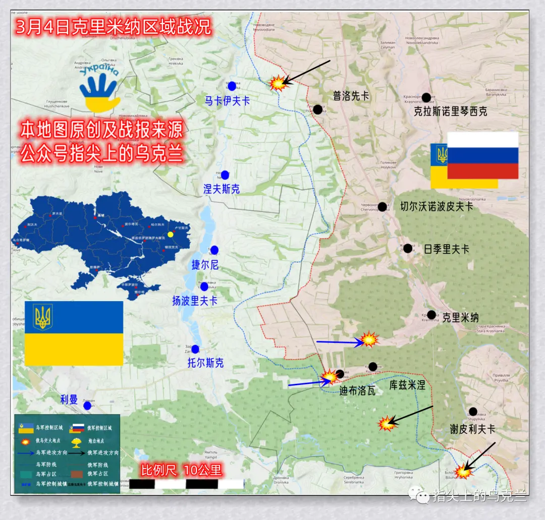 克里米纳周边,俄军在比洛戈里夫卡与谢尔布良卡和马卡伊夫卡区域发动进攻,乌军在迪布洛瓦与克里米纳西部森林中发动进攻,双方的战斗不是很激烈,控制的区域也没什么变化。今天的战报到此结束!