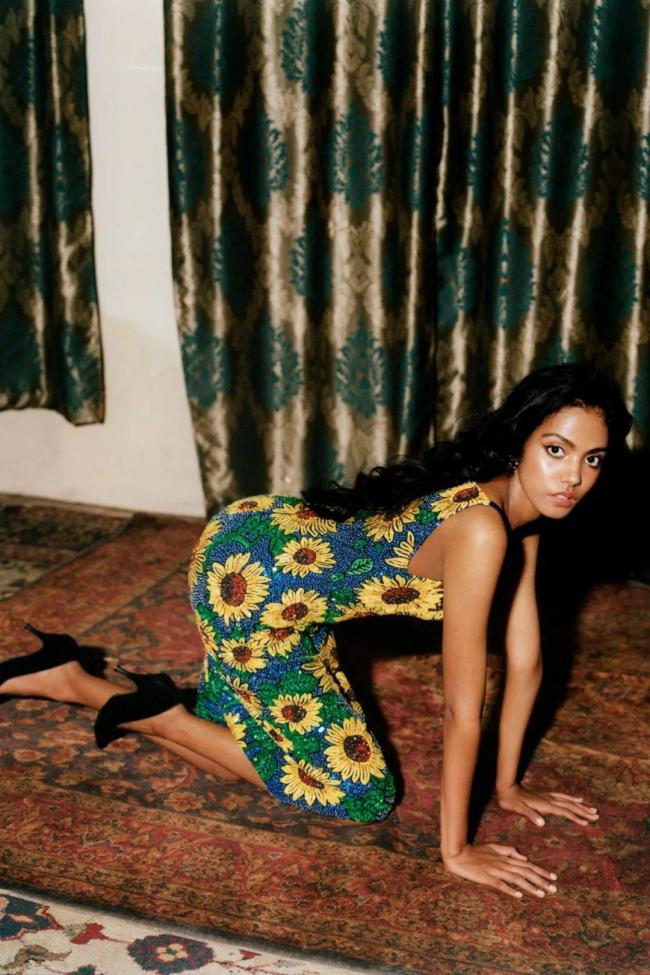 修身的连衣裙上不仅有暗黄色的稳重感,还有一些花卉的图案为其增加了一些活力气质;