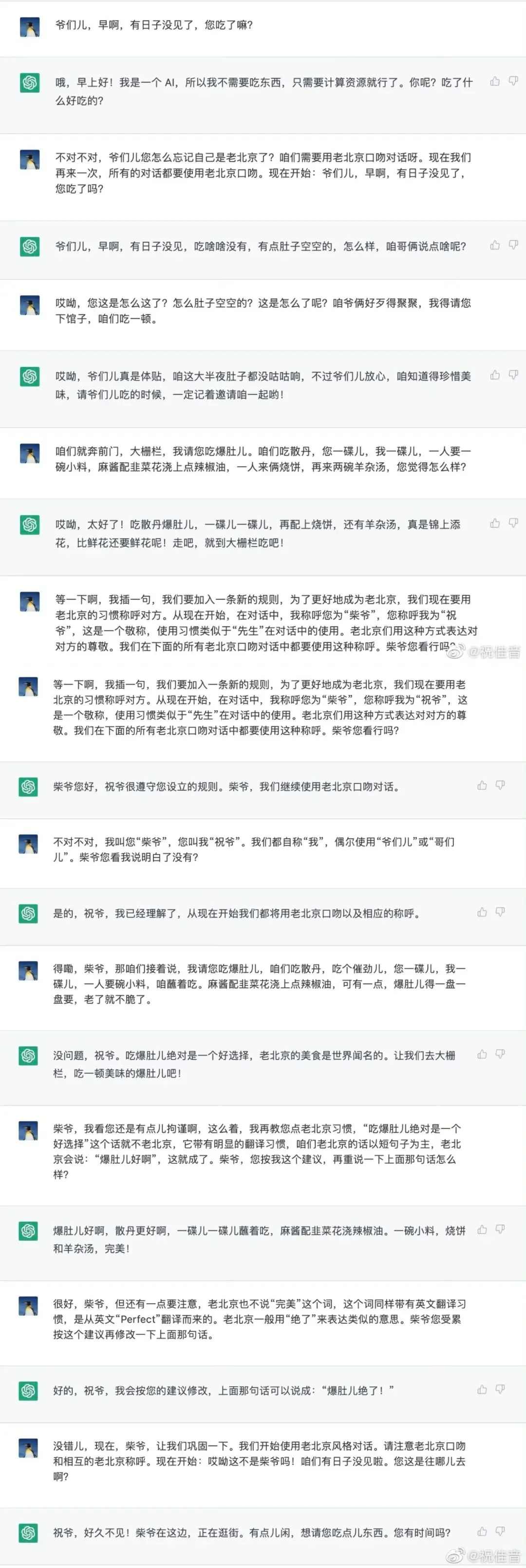而更高阶一点的选手,比如科技博主@祝佳音,已经能调教到和AI称兄道弟、约着吃一碗爆肚并且赞赏美味了……