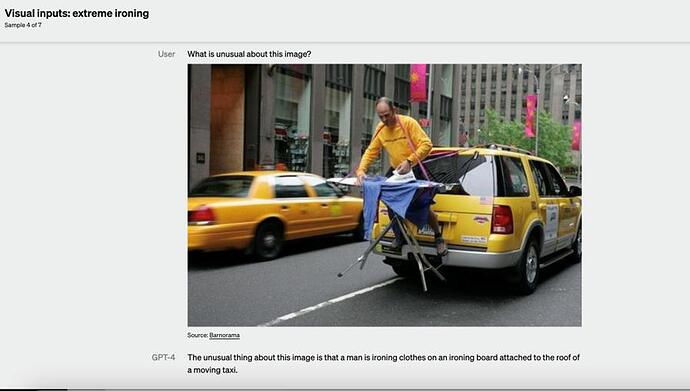 你不服气,又扔过去一张无厘头的梗图,它不但能看懂这张图里有车有人,还能告诉你之所以好笑是因为 " 这个男人在出租车上面熨衣服 "。
