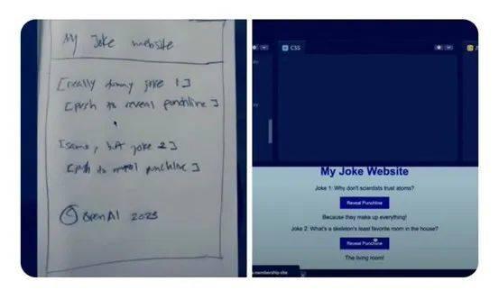 在官方演示视频中,OpenAI 总裁兼联合创始人格雷格 · 布罗克曼(Greg Brockman)用笔和纸画了个网站展示给 GPT-4,后者仅用 1 到 2 秒的时间,就生成了网页代码、制作出了几乎与图中一模一样的网站。