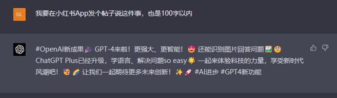 接下来,是社交媒体文案比拼。我们让 ChatGPT 将之前的消息压缩为 100 字左右的小红书文案,GPT-4 直接给出了完整的标题、文案甚至是话题标签。而且文本中插入了很多小红书常见的 emoji 表情,达到了可以直接拿来用的程度。