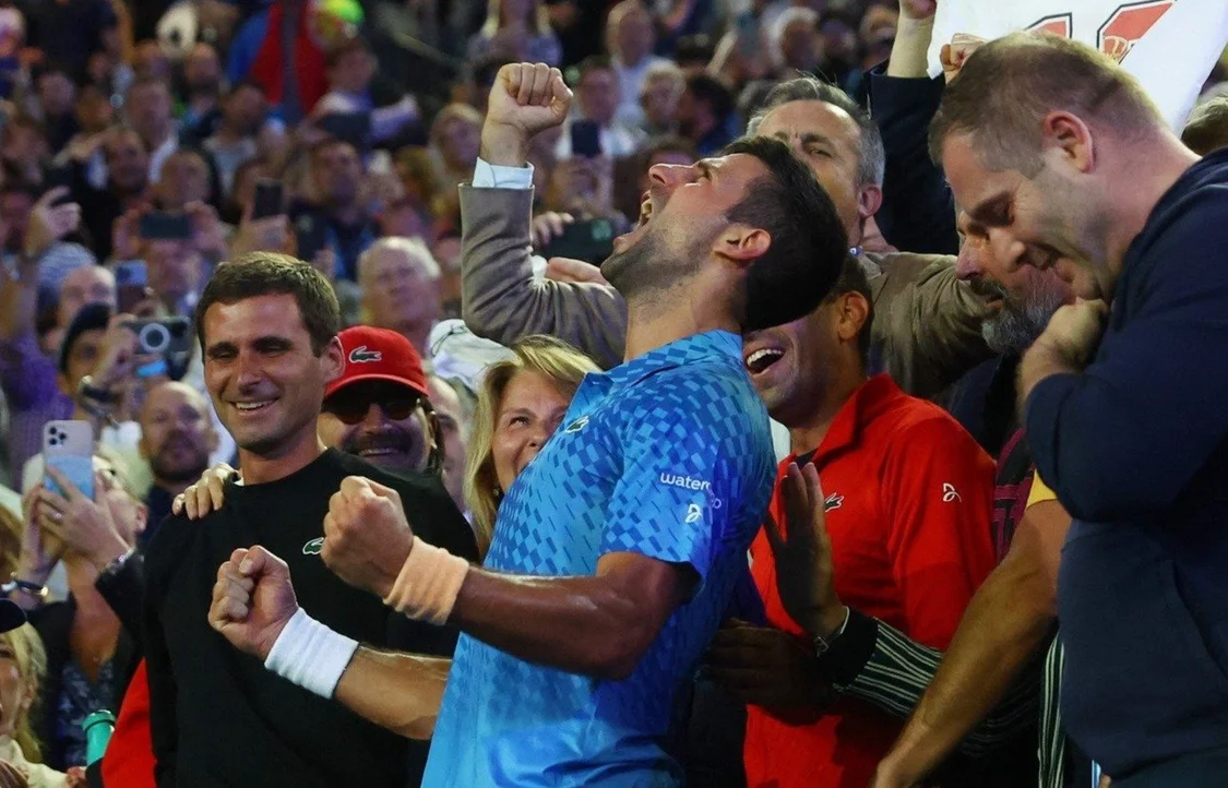第一时间,他越过护栏冲上球员包厢和亲友团拥抱,母亲、兄弟、教练……过去一年,他们见证了德约科维奇从网球选手变成时政新闻人物又回归体育的过程,一同经历了其中的委屈、挫败、失落,当然还有荣耀。