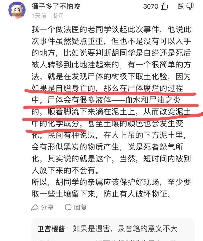 另外,还有一名非正能量的法医,给出了这样一个建议。说如果自缢百日,那么尸体腐烂的过程中,会有血水和尸油之类的东西滴落,从而改变土壤的化学成分。因此,只要对下方的土壤进行采样,就能作出是否为第一现场的判断。