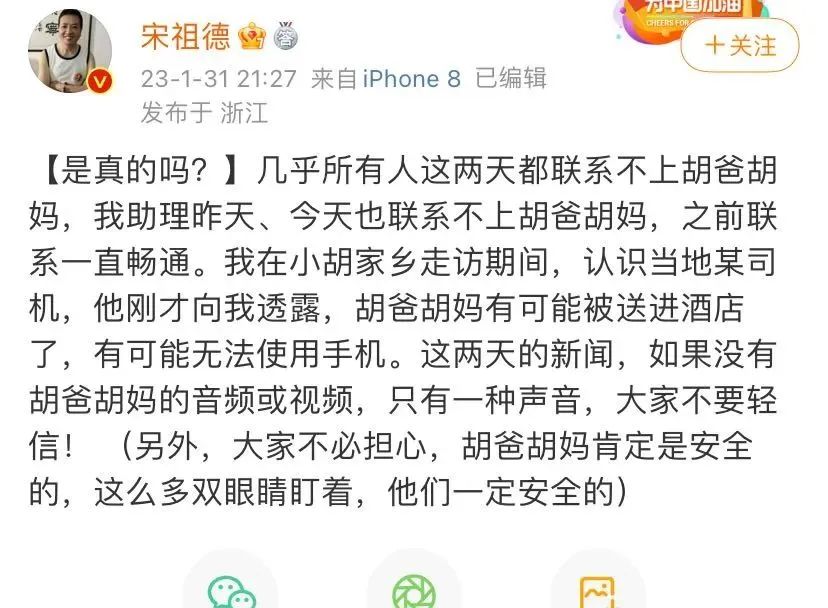 此前有微博大V宋祖德表示,胡鑫宇的父母可能被请去一家酒店,失去了网络自由。一开始我是不信的,但今天突然发现宋的微博被禁言,这下就不知道该不该信了。