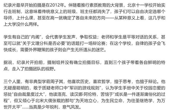 为了吹嘘所谓精英教育开明,这个作者特意讲了个事,说,北京十一学校有个学霸,叫周子其,喜欢历史,哲学,擅长思考。周子其不满军训,跟校方交涉,然后学霸一通洛克、汉娜·阿伦特,辩经输出,军训天数就被砍了。