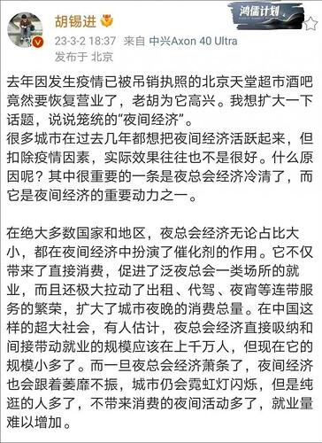 老胡说现在很多城市的夜间经济不行,其中很大的原因就是“夜总会经济”冷清了,为此,他还对比了其他国家的夜总会情况,从而肯定了夜总会对经济的重大贡献。