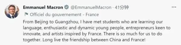 4月7日,马克龙在推特上用法文、中文、英文连发“中法友谊万岁!”