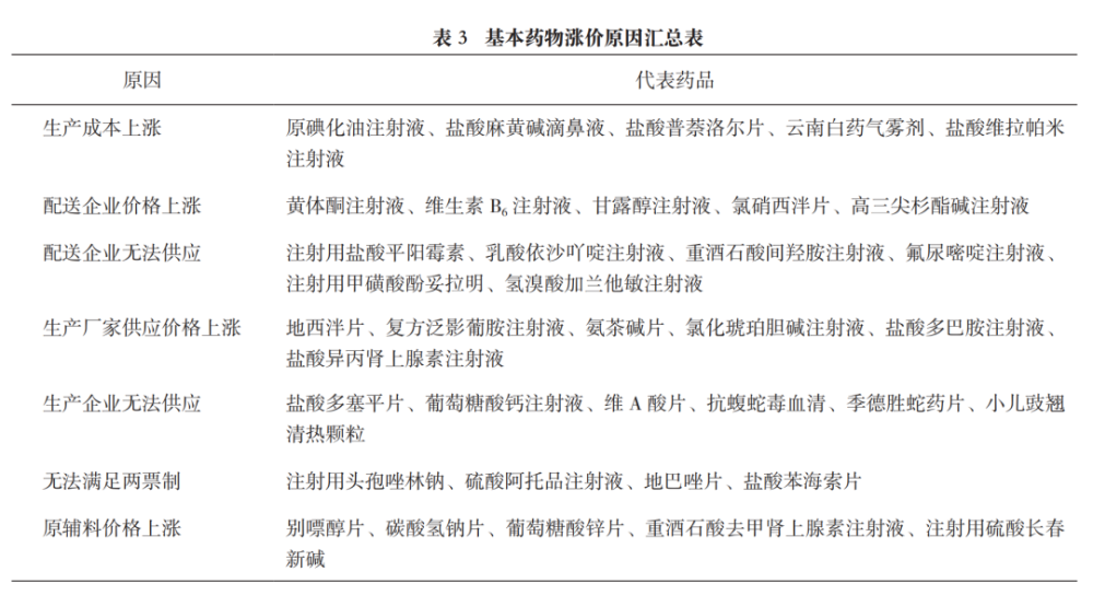 许日祥等于2018年刊载于《中国药事》的调查论文[2]显示,基本药物涨价的原因包括但不限于生产成本上涨、生产厂家供应价格上涨、无法满足两票制、原辅料价格上涨等因素。