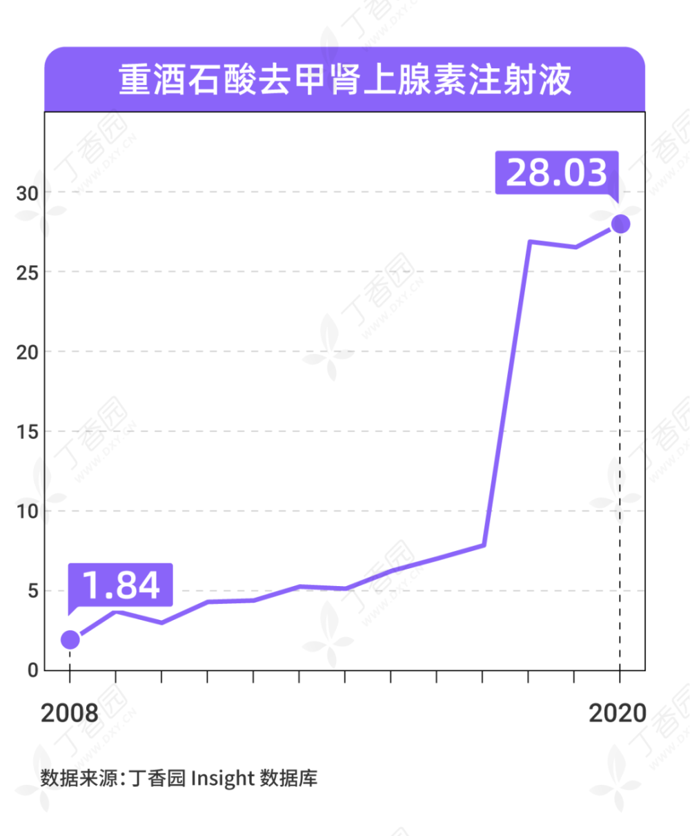 根据丁香园Insight数据库信息,重酒石酸间羟胺注射液在2011年的平均最小规格中标价为2.42元,到了2018年则涨至54.6元。而盐酸多巴胺注射液在2019年一度从最低价0.4元(2011年平均最小规格中标价)涨至6.14元,不过到了2020年,则略有下跌至4.16元。