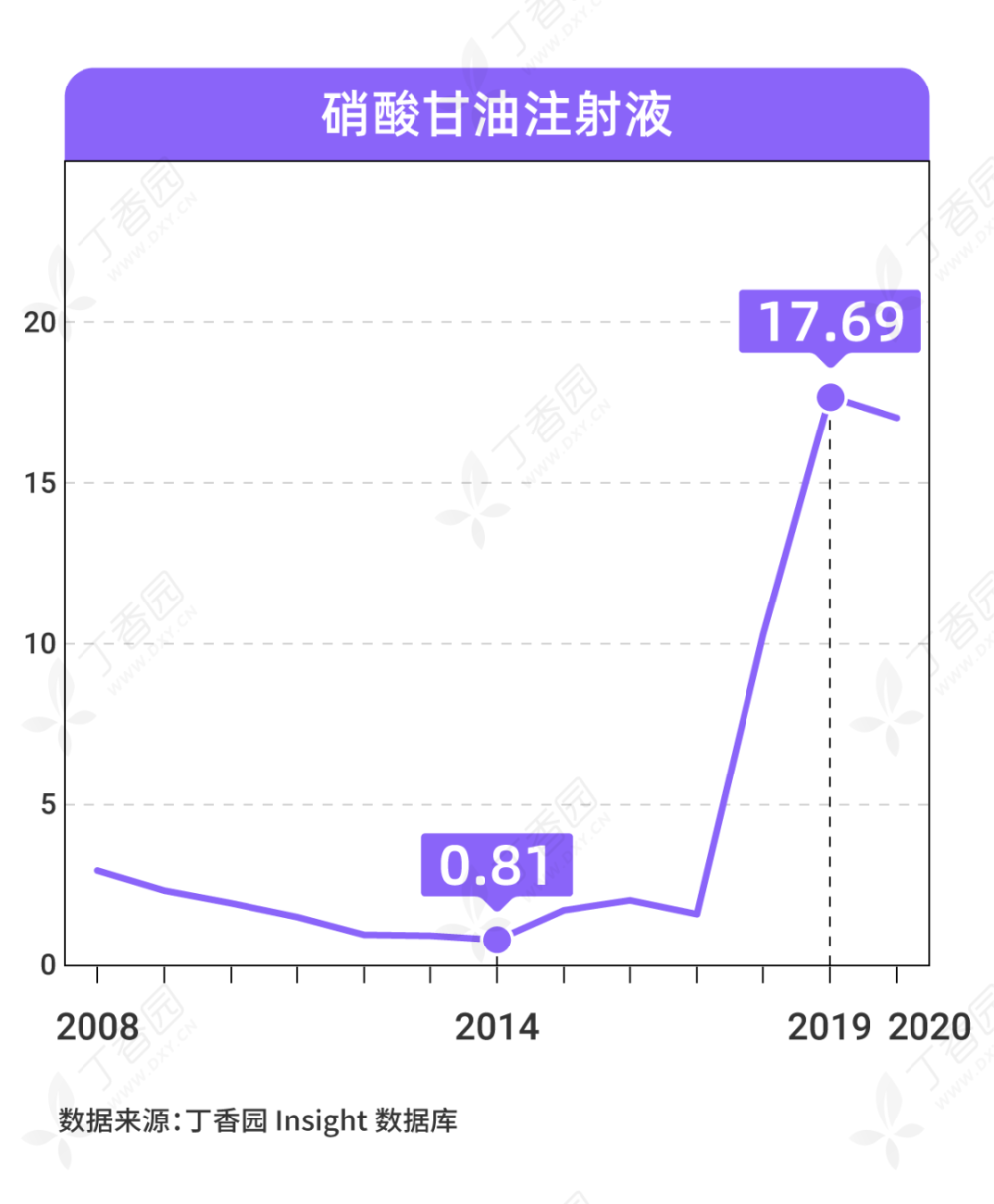 如西地兰(去乙酰毛花苷注射液),在2008~2020年间最低价为2.60元(2009年平均最小规格中标价),而到了2019年却一度涨至83.81元,到2020年维持在82元。