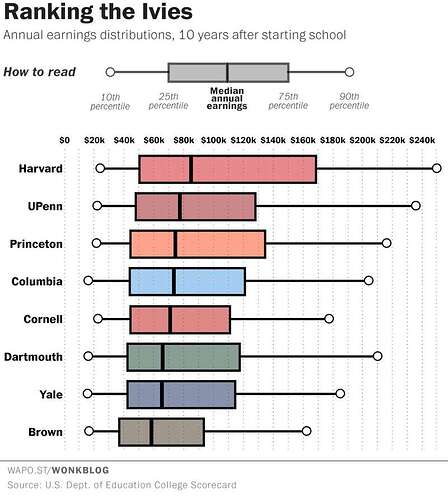 更直观地和普通大学对比来看,上大学10年后,藤校毕业生的收入是其他大学毕业生的两倍多。事实上,常春藤毕业生的平均薪资中位数,比其他学校的前10%还要多!