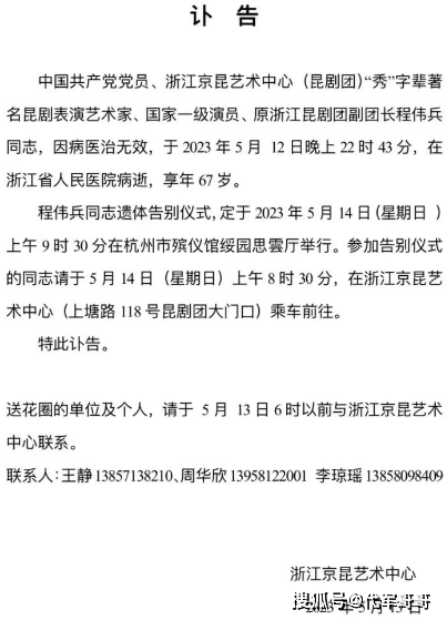 5月13日,浙江京昆艺术中心发布讣告,称著名昆剧表演艺术家、国家一级演员、原浙江昆剧团副团长程伟兵因病医治无效,于5月12日晚上22时43分病逝,享年67岁,告别仪式定于5月14日上午,地点系杭州市殡仪馆绥园思雩厅。